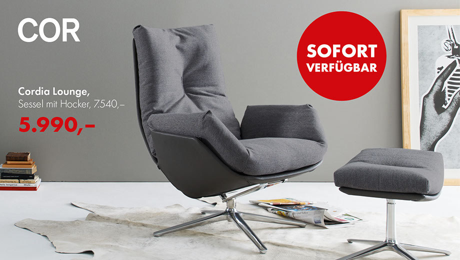 Sichern Sie sich jetzt den außergewöhnlich bequemen Cordia Lounge von COR, inklusive Hocker, in einer eleganten Leder-Stoff-Kombination* mit poliertem Aluminium-Untergestell – Sofort verfügbar und zum Sonderpreis von 5.990,– EUR.