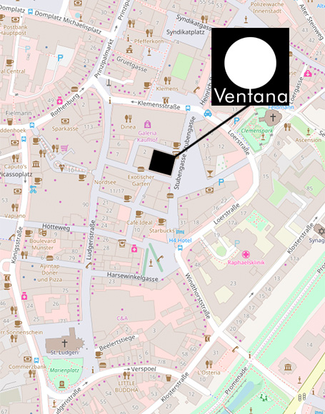 Ventana befindet sich in einer Fußgängerzone. Die Parkhäuser "Stubengasse" und "Karstadt" befinden sich in unmittelbarer Nähe. Folgen Sie einfach dem Münsteraner Parkleitsystem. Aktuelle Informationen über freie Plätze in den Parkhäusern finden Sie hier: